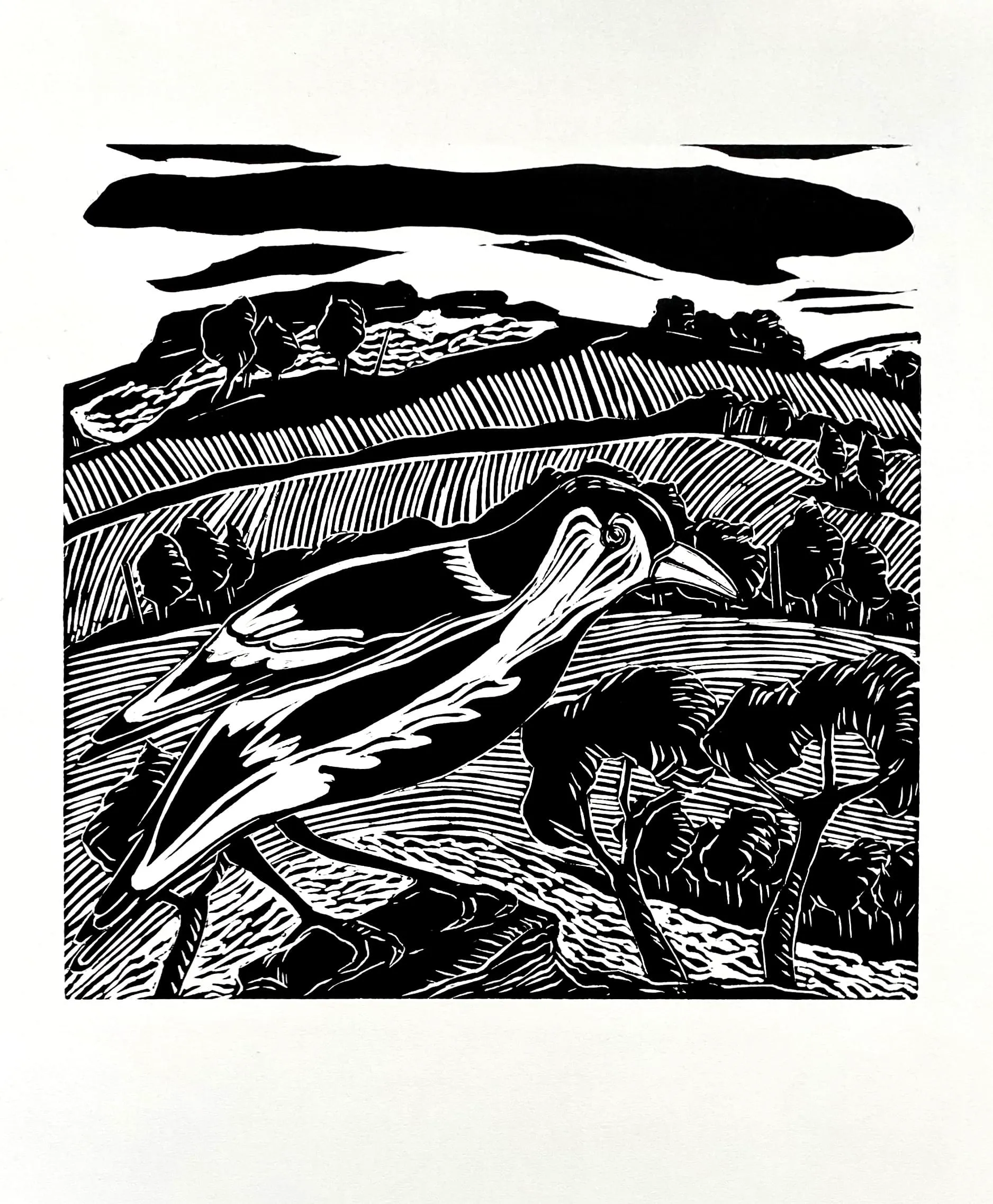 Bird's Eye View is a black and white lino print on Stonehenge paper. The work is behind glass, with a black timber frame and neutral matt board