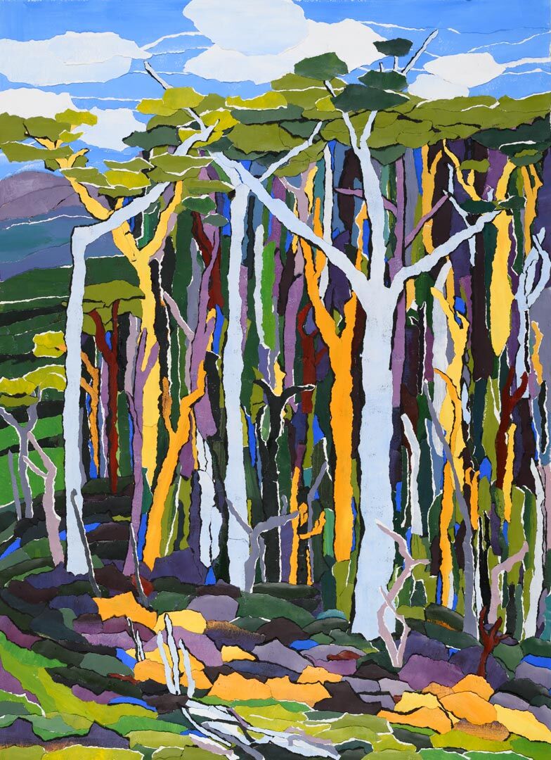 Forest Edge is a large hand painted collage depicting the edge of a large forest over looking a rural landscape. The work was created by tearing hand painted paper and reassembling this paper into the finished collage where surface, colour, movement and the torn white and black edges are as important to the piece as the subject itself. This collage was a finalist in the Banyule Award for Works on Paper 2021 and awarded the People's Choice Award.
